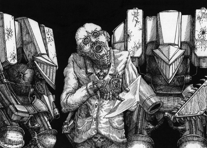 One of my Warhammer 40,000 illos, this cybernetic bean-counter with his bodyguard robots collects the Public Obedience Life Levy!!