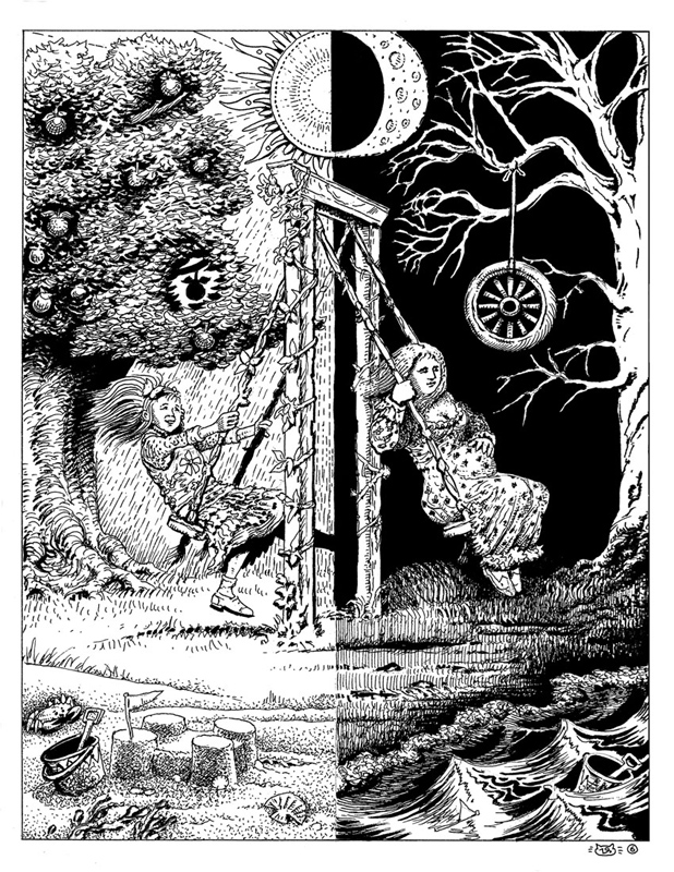 One of my more unusual and interesting commissions was for a series of drawings illustrating aspects of Hermetic doctrine. Since I've always had an artist's fascination with symbolism and esoteric philosophies this was right up my alley! This illustrates the Doctrine of Rhythm which is that the universe tends to be cyclical, with events transpiring in circles, (or more precisely spirals) along the axis of time |