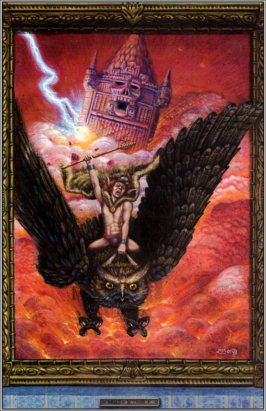 The Prince of Wands is the owl-rider,wearing a golden fleece and ram's