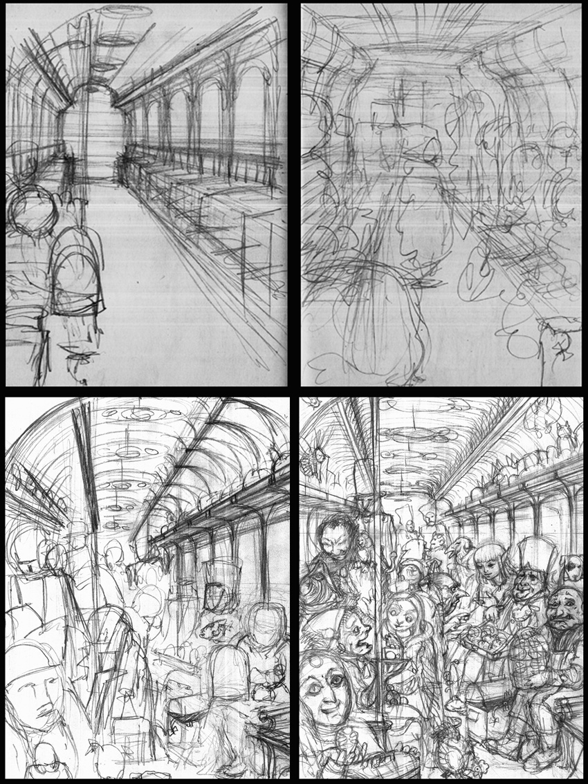 From thumbnail rough to full drawing: This shows the development of one of my illos for the Spellcaster Gamebook "The Forgotten Spell", depicting a strange 'Flea Market' in a tram in a weird elven city. This was to be a highly complex illo containing a lot of characters and little narratives for the reader to spot. How to fit it all into the space provided?